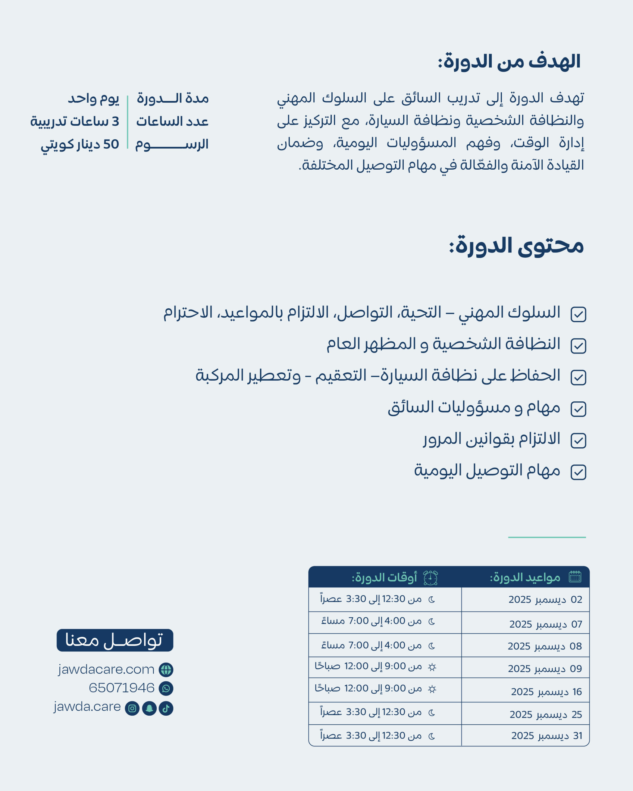| اختار جدول المواعيد | December 02, 2025 – 12:30 PM – 3:30 PM, December 07, 2025 – 4:00 PM – 7:00 PM, December 08, 2025 – 4:00 PM – 7:00 PM, December 09, 2025 – 9:00 AM – 12:00 PM, December 16, 2025 – 9:00 AM – 12:00 PM, December 25, 2025 – 12:30 PM – 3:30 PM, December 31, 2025 – 12:30 PM – 3:30 PM |