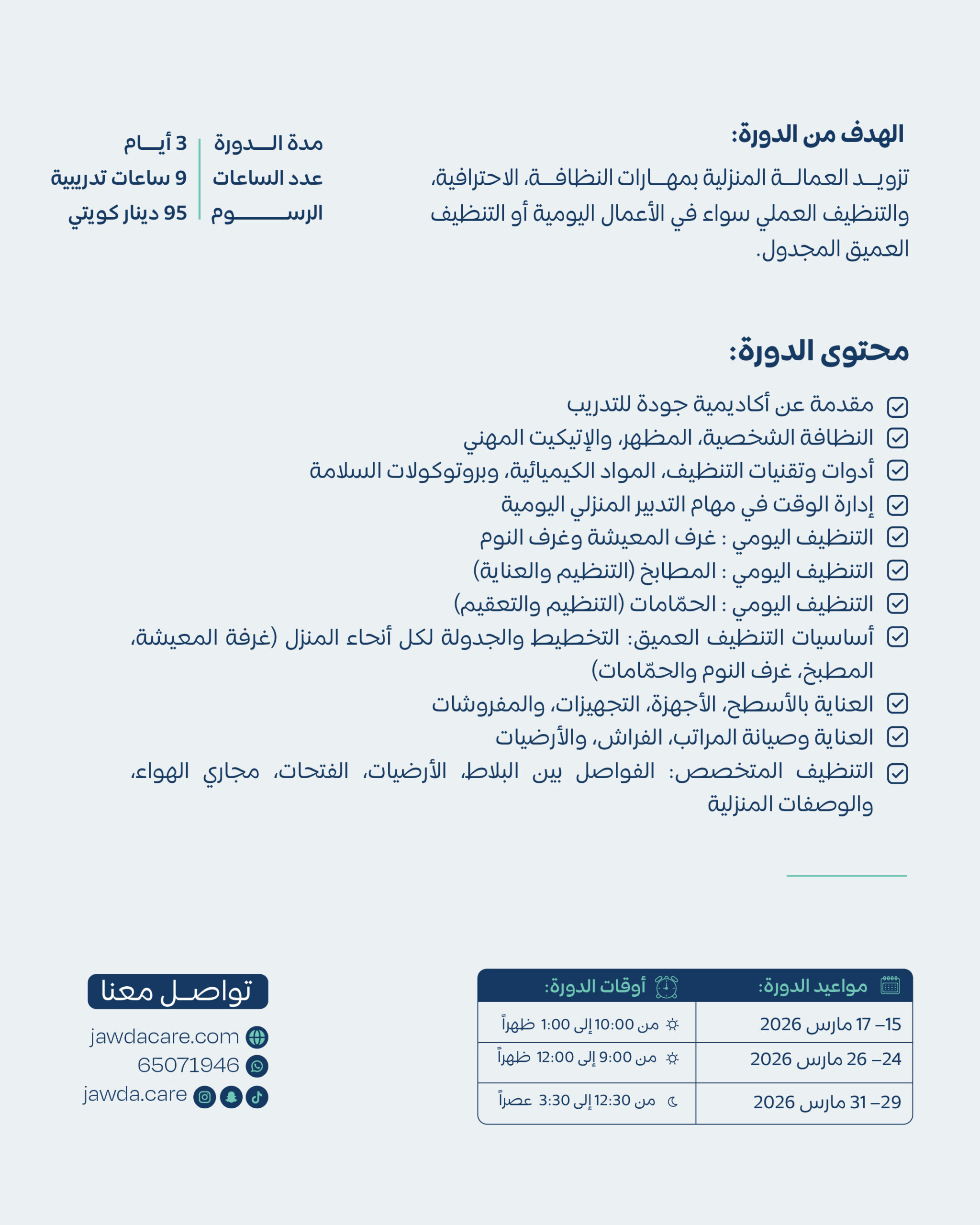| اختار جدول المواعيد | March 15 – 17 2026 – 10:00 AM to 1:00 AM, March 24 – 26 2026 – 9:00 AM to 12:00 PM, Mach 29 – 31 2026 – 12:30 PM to 3:30 PM |