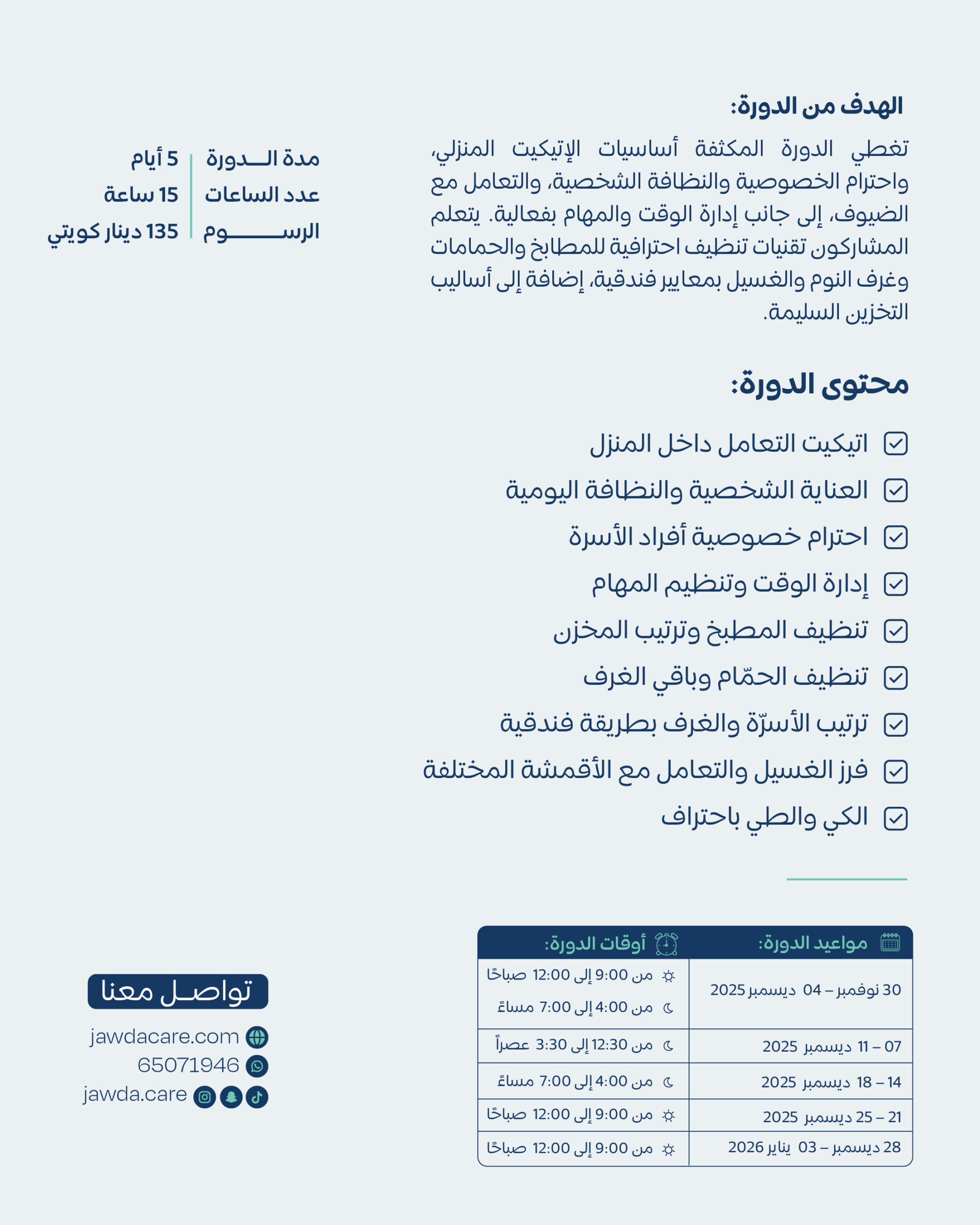 | اختار جدول المواعيد | November 30 – December 04, 2025 – 9:00 AM – 12:00 PM, November 30 – December 04, 2025 – 4:00 PM – 7:00 PM, December 07 – 11, 2025 – 12:30 PM – 3:30 PM, December 14 – 18, 2025 – 4:00 PM – 7:00 PM, December 21 – 25, 2025 – 9:00 AM – 12:00 PM, December 28, 2025 – January 03, 2026 – 9:00 AM – 12:00 PM |