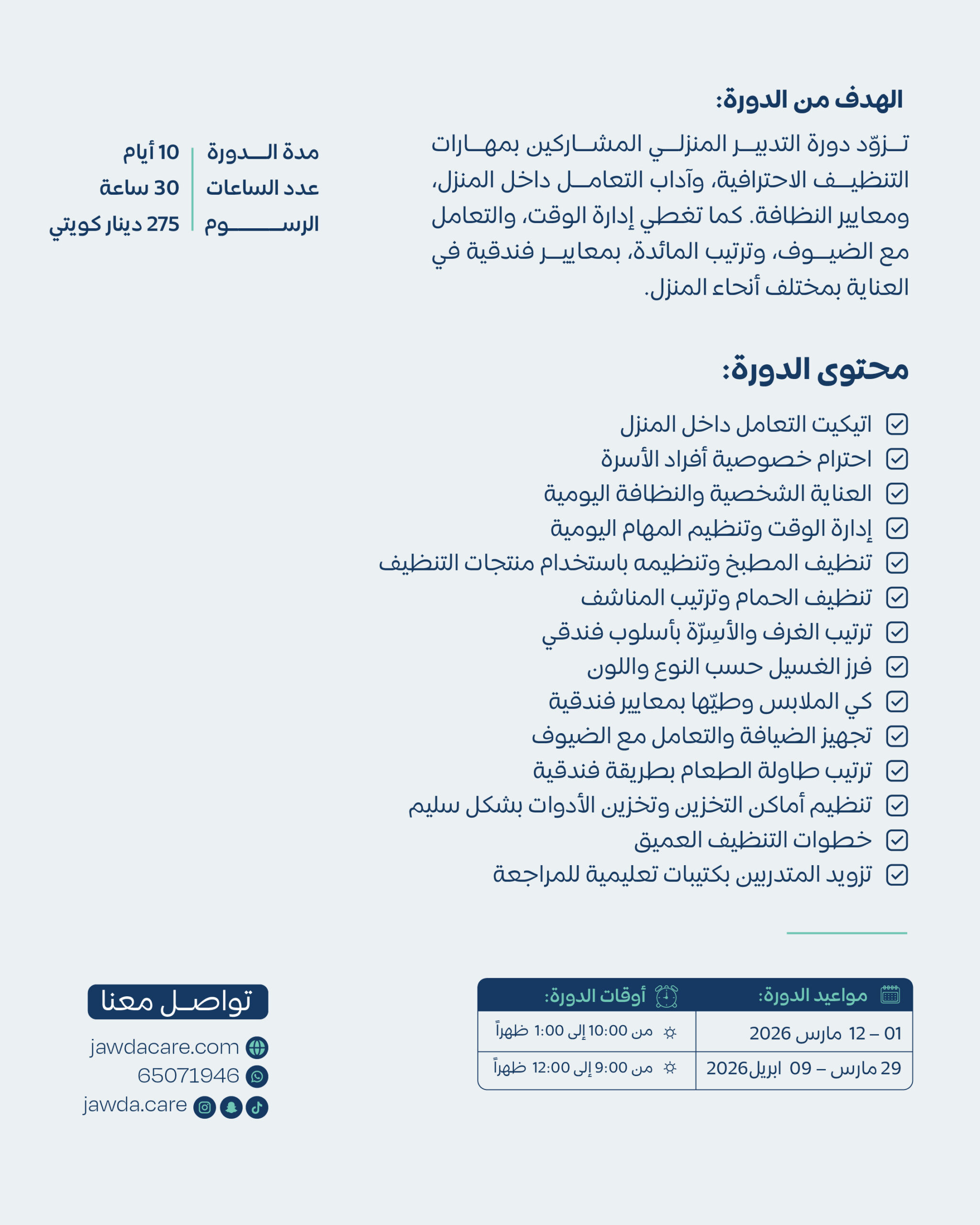 | اختار جدول المواعيد | March 01 – 12, 2026 – 10:00 AM to 1:00 PM, March 29 – Apr 9, 2026 – 9:00 AM to 12:00 PM |