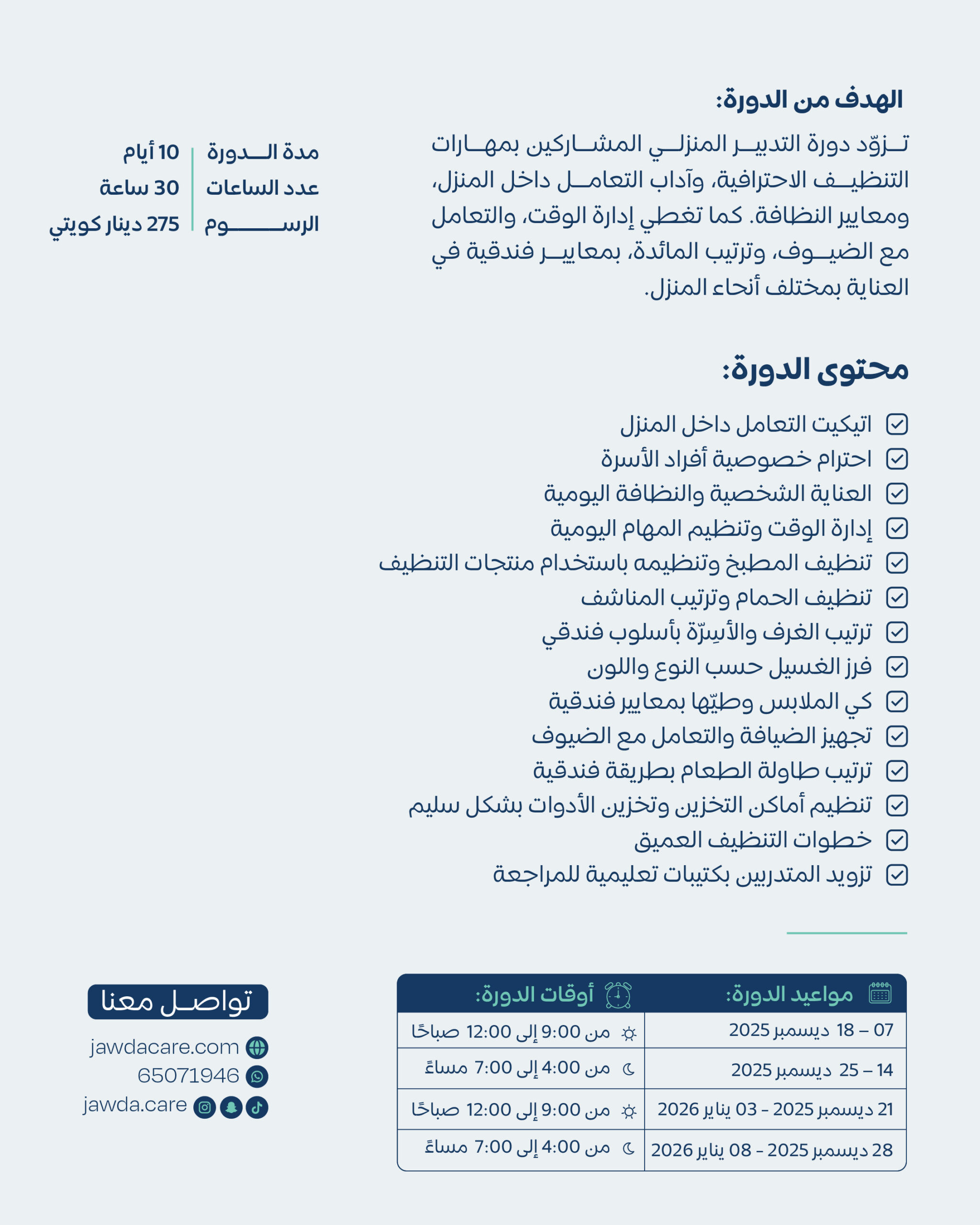 | اختار جدول المواعيد | December 07 – 18, 2025 – 9:00 AM – 12:00 PM, December 14 – 25, 2025 – 4:00 PM – 7:00 PM, December 21, 2025 – January 03, 2026 – 9:00 AM – 12:00 PM, December 28, 2025 – January 08, 2026 – 4:00 PM – 7:00 PM |
