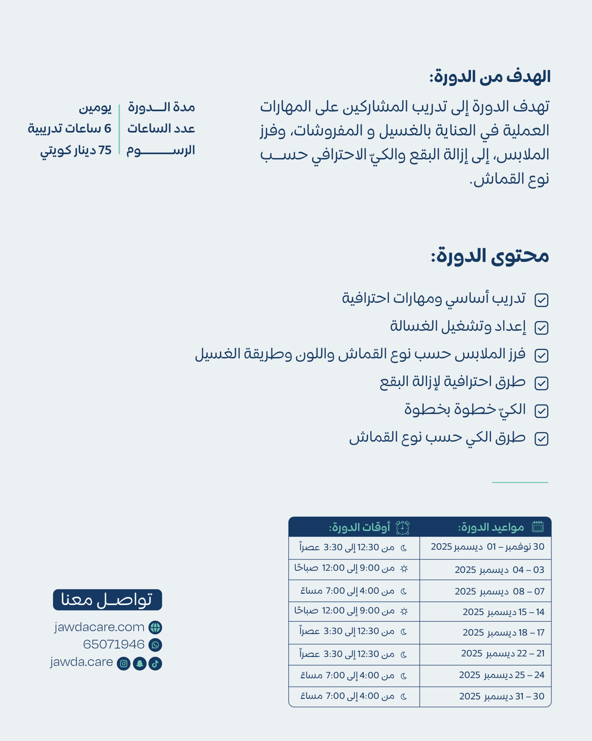 | اختار جدول المواعيد | November 30 – December 01, 2025 – 12:30 PM – 3:30 PM, December 03 – 04, 2025 – 9:00 AM – 12:00 PM, December 07 – 08, 2025 – 4:00 PM – 7:00 PM, December 14 – 15, 2025 – 9:00 AM – 12;00 PM, December 17 – 18, 2025 – 12:30 PM – 3:30 PM, December 21 – 22, 2025 – 12:30 PM – 3:30 PM, December 24 – 25, 2025 – 4:00 PM – 7:00 PM, December 30 – 31, 2025 – 4:00 PM – 7:00 PM |
